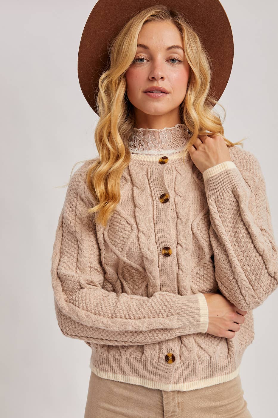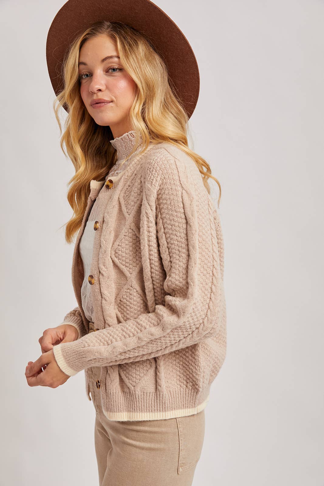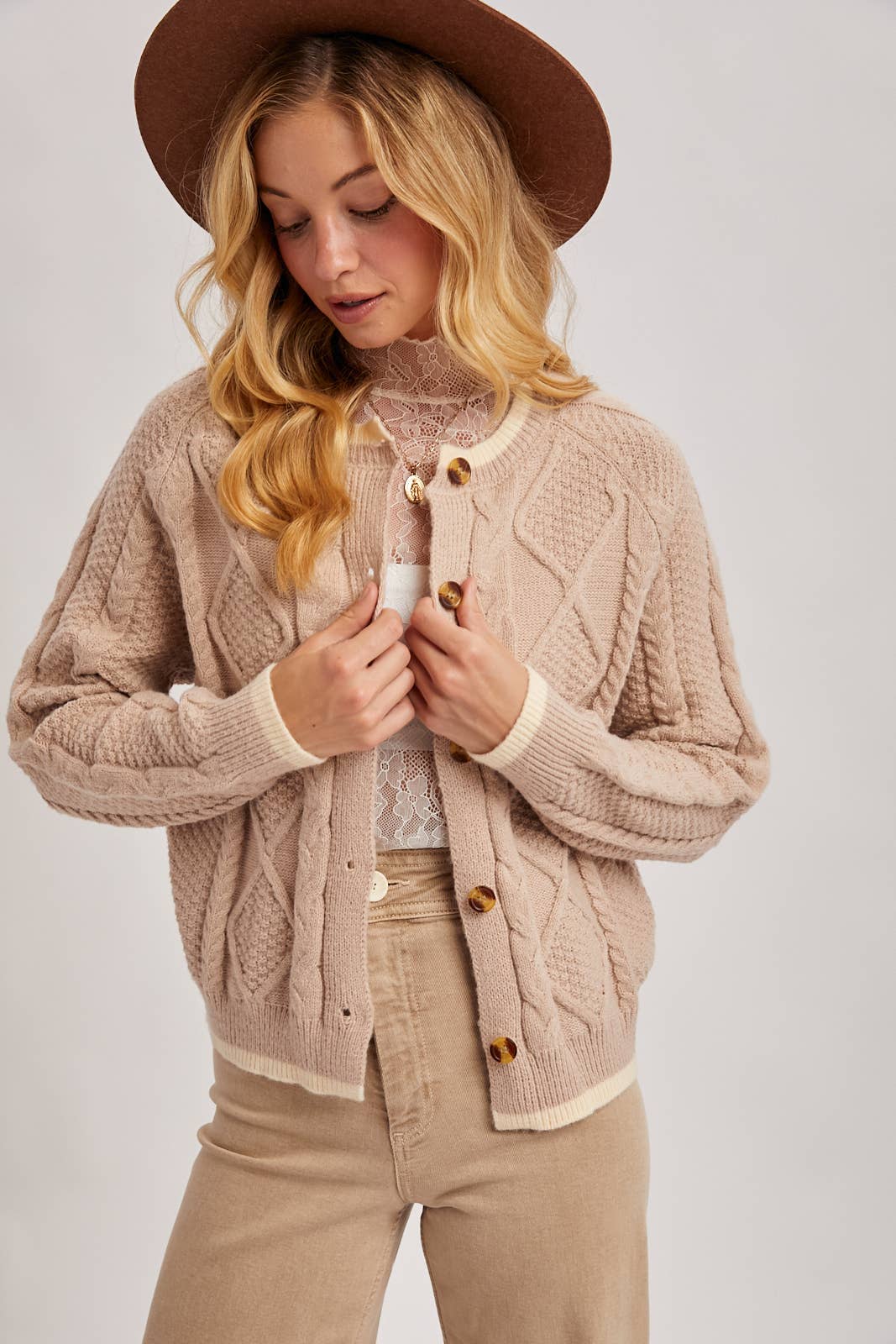 This is a charming and cozy cable-knit cardigan. It features a rich tapestry of traditional knit patterns, including classic vertical cable braids and a textured diamond motif, giving it a substantial and intricate feel. The cardigan has a classic crew neckline and a button-front closure with contrasting dark brown, tortoise-shell-like buttons. A distinctive detail is the contrasting cream-colored trim along the ribbed neckline, cuffs, and hem, adding a touch of classic, preppy style. The overall design combines the timeless appeal of an Aran sweater with modern, feminine touches, making it a perfect layering piece.