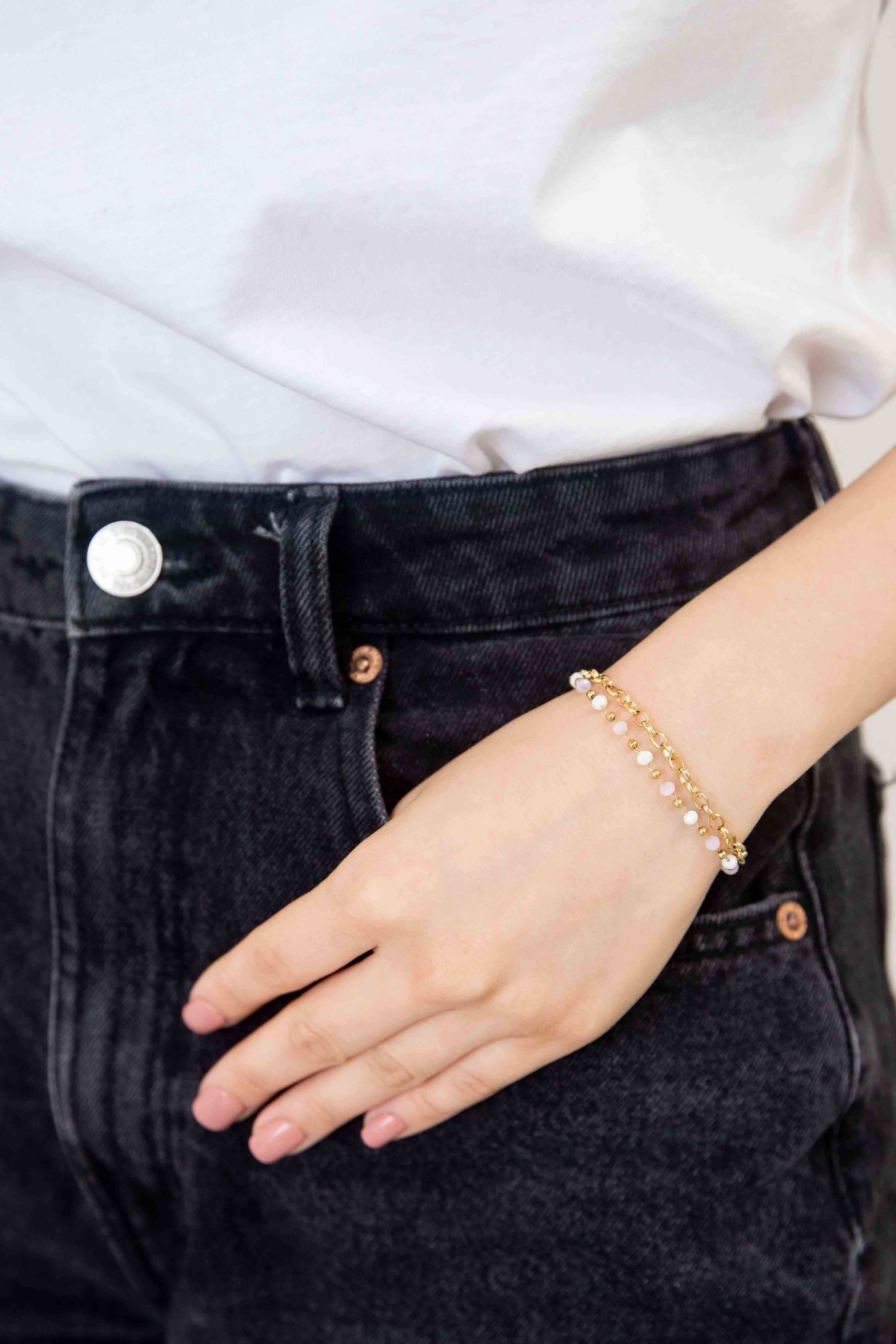 Double layered bracelet with a pink and white beaded layer and a chain as the second layer.