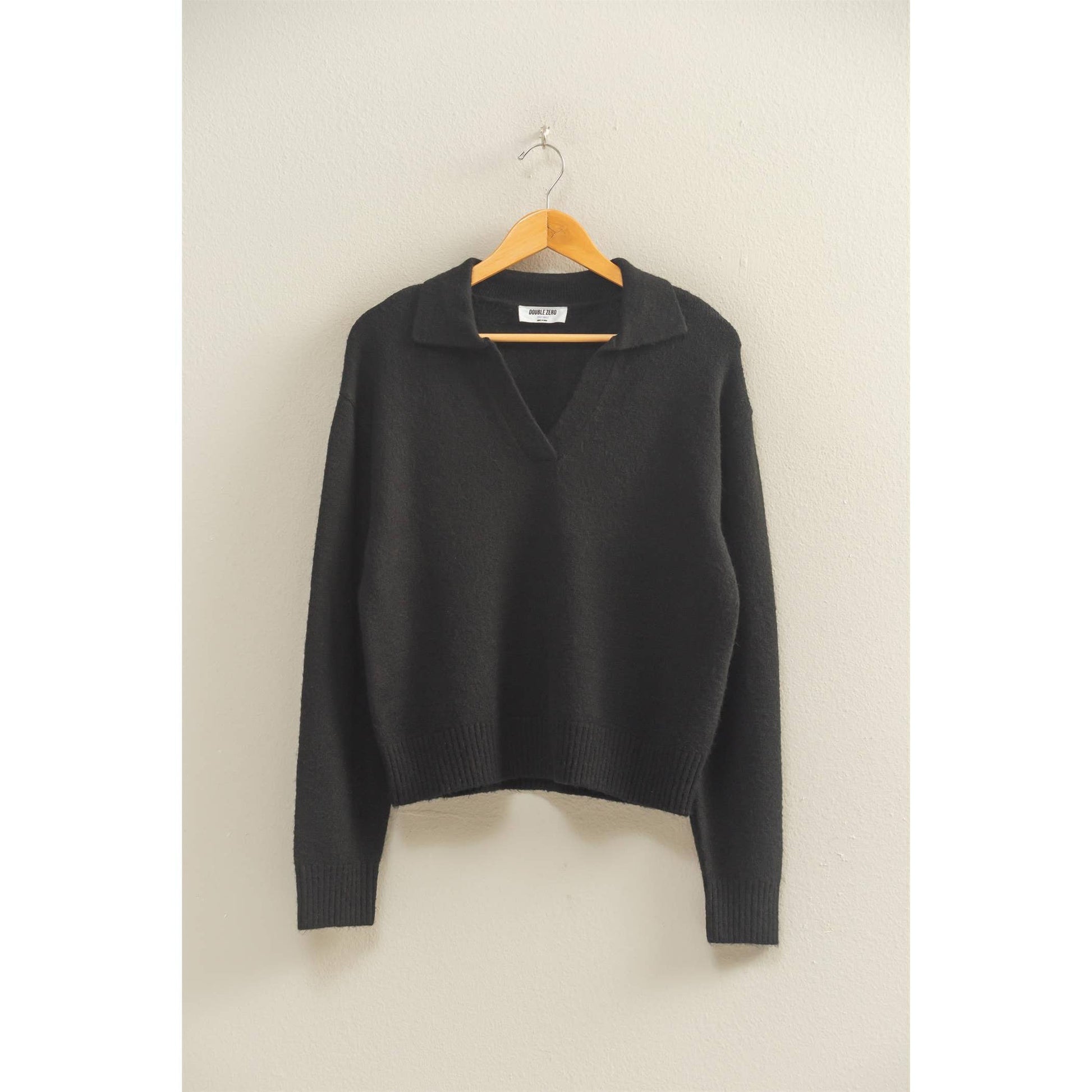 This relaxed-fit knit sweater features an open V-neckline with a soft, laid-back collar for a polished yet casual feel. Designed with dropped shoulders and full-length sleeves, it offers a comfortable silhouette that's easy to layer. Ribbed trims at the cuffs and hem add structure, making it a versatile piece for everyday wear.