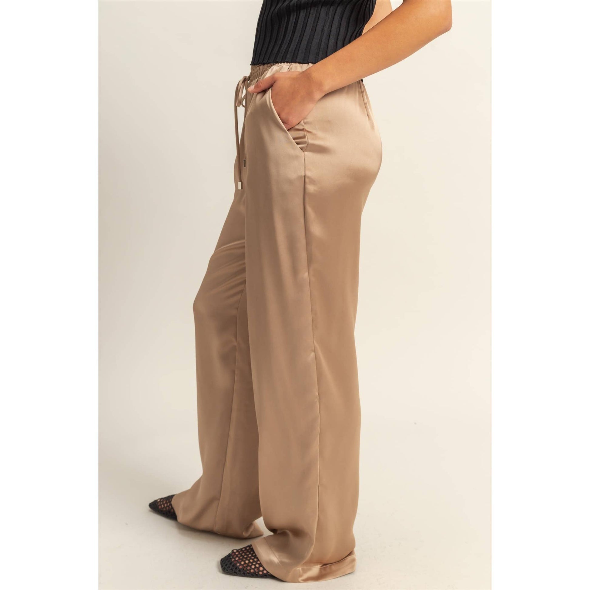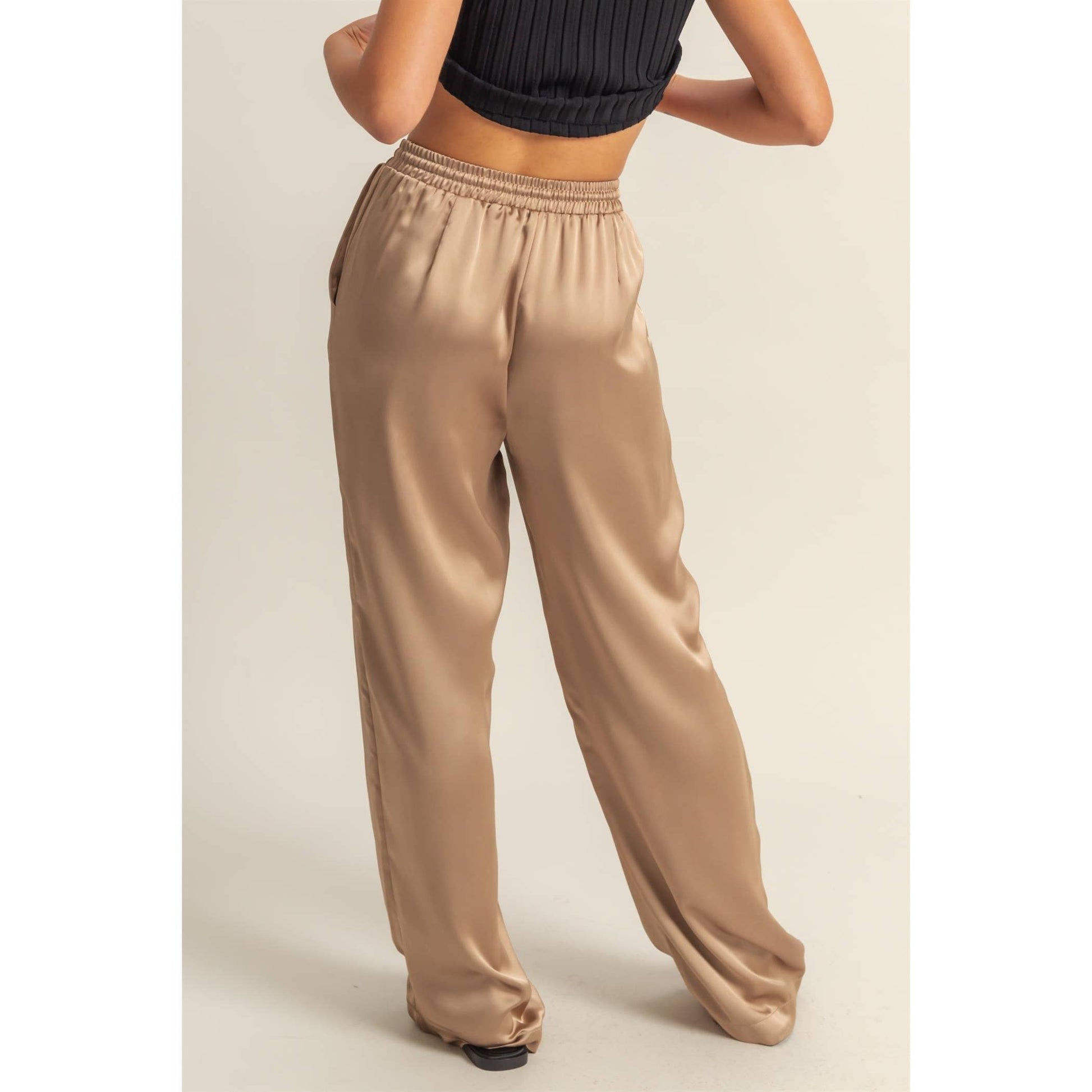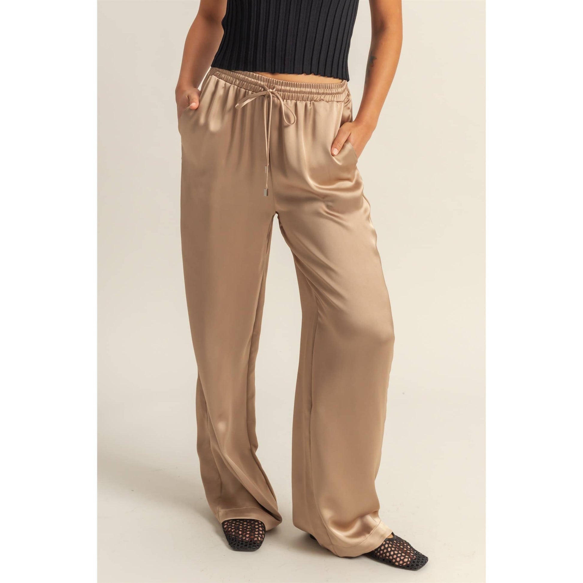 These satin pants are your go-to for everything from office meetings to after-hours fun! Featuring a high-rise elastic waist with a playful drawstring, they offer a super flowy silhouette that keeps you feeling light and breezy all day long.