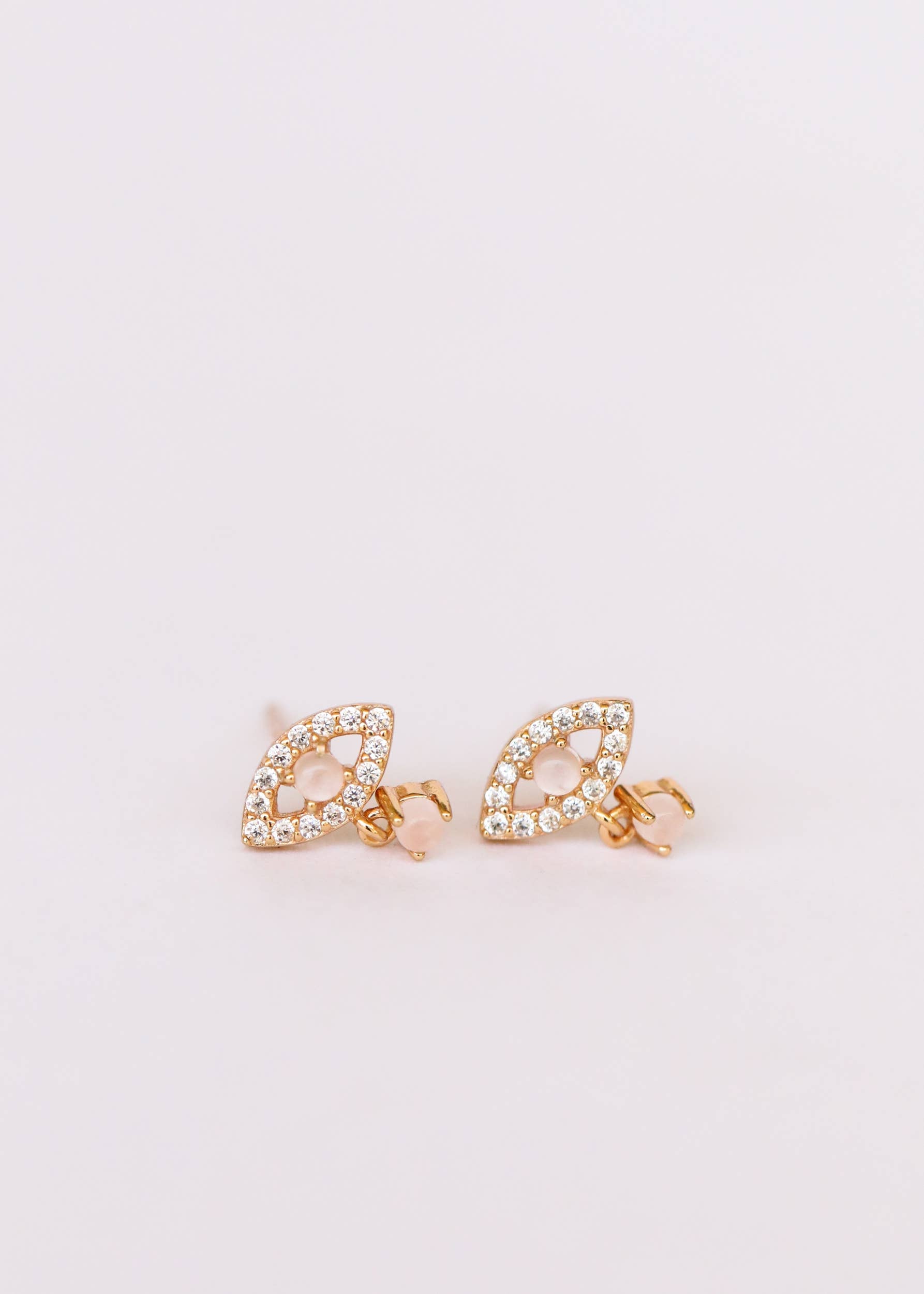 A CZ-encrusted evil eye stud has a petite gemstone hanging from the center.