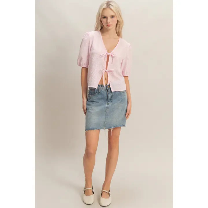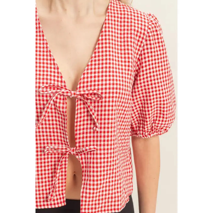 Featuring a gingham print all over, this blouse has short, puff sleeves and a front open design. The bow accents along the front complete the look.