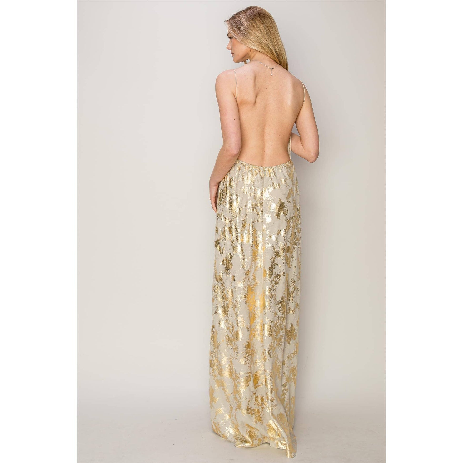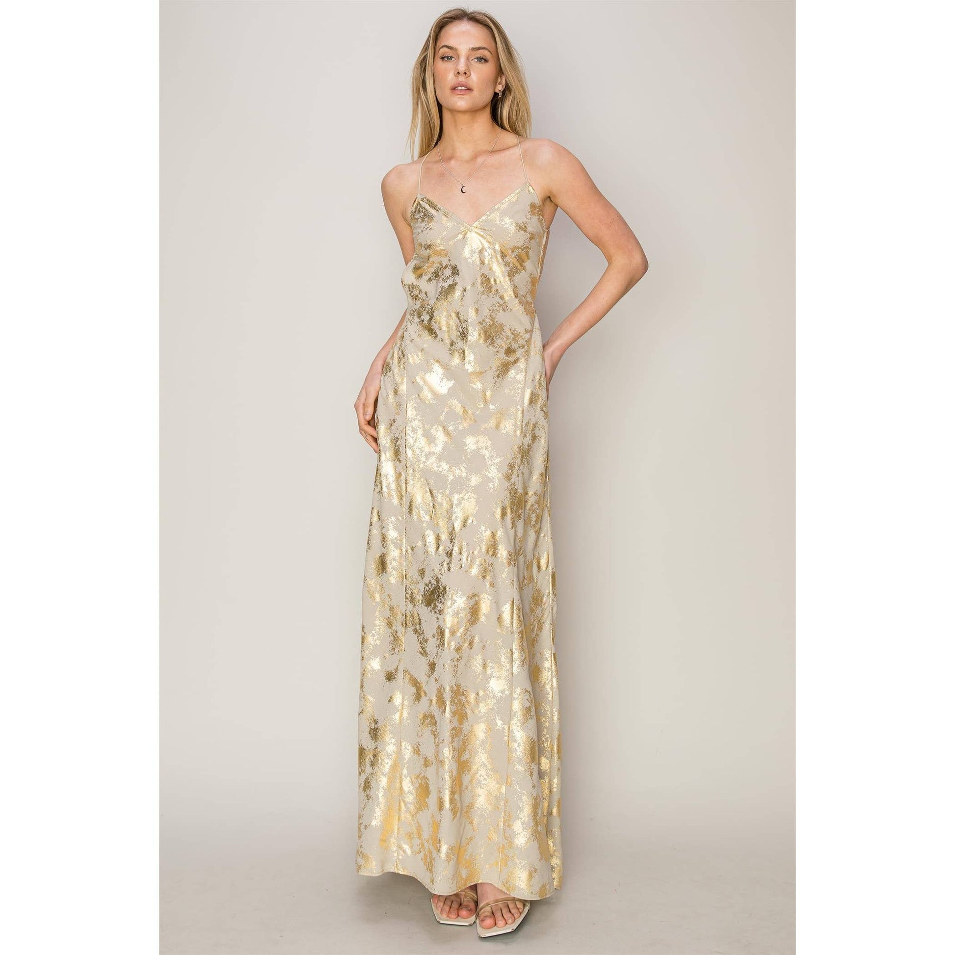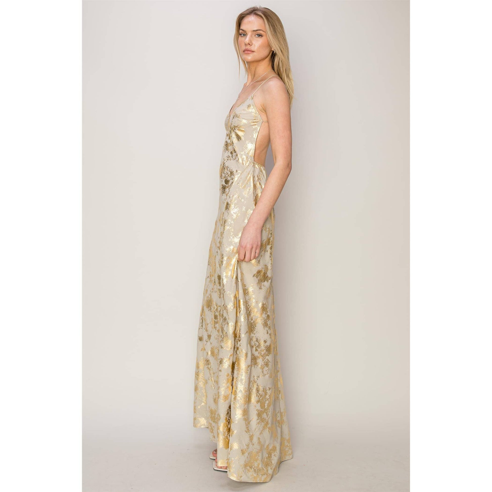 Transform your figure with this slip dress that exudes glamour through its metallic foil print. Featuring a V-neck, thin shoulder straps, and an open back, this dress is designed to flatter. The hip-hugging silhouette ensures a timeless look.
