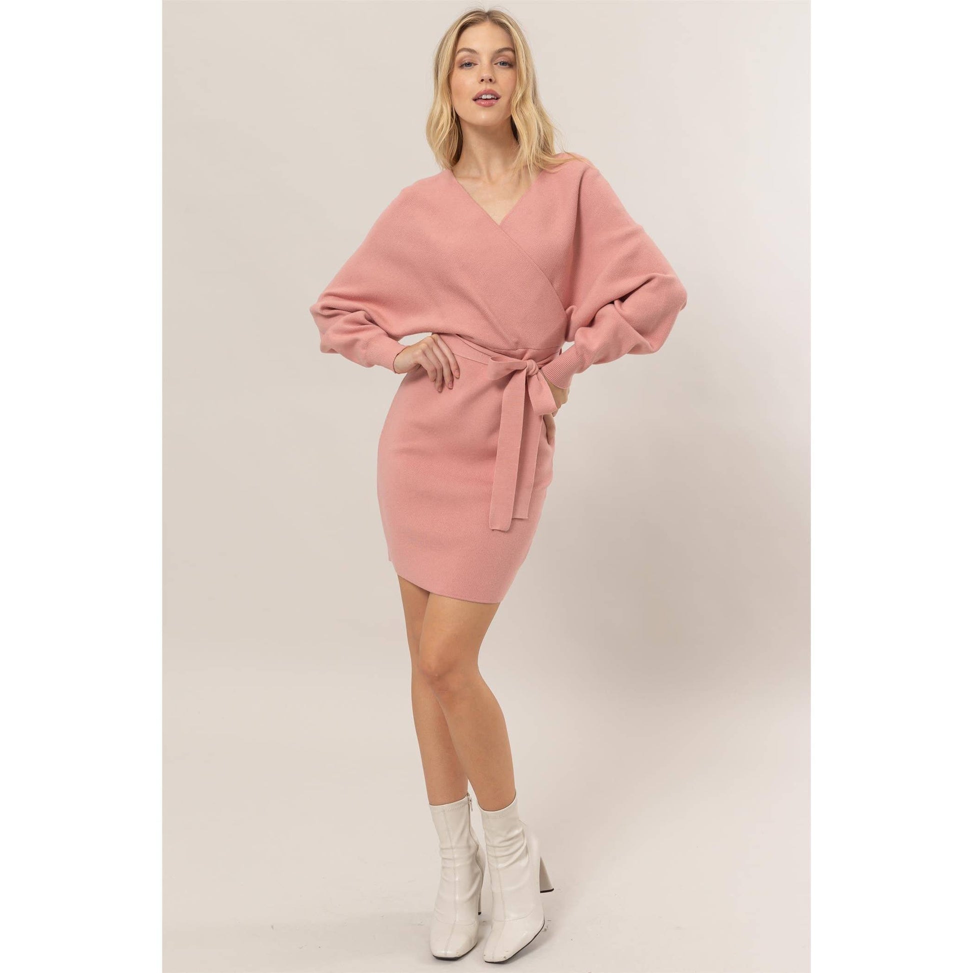 We're So Excited To Introduce This Knit Mini Dress. Incredibly Chic, It Showcases A Wide V-Neckline And Long Dolman Sleeves. The Relaxed, Surplice Bodice Tops A Self-Tie Sash Belt For You To Cinch The Fit, Complete With A String Connected At The Back.