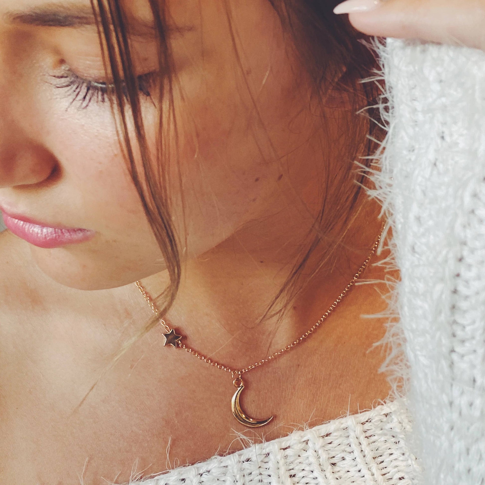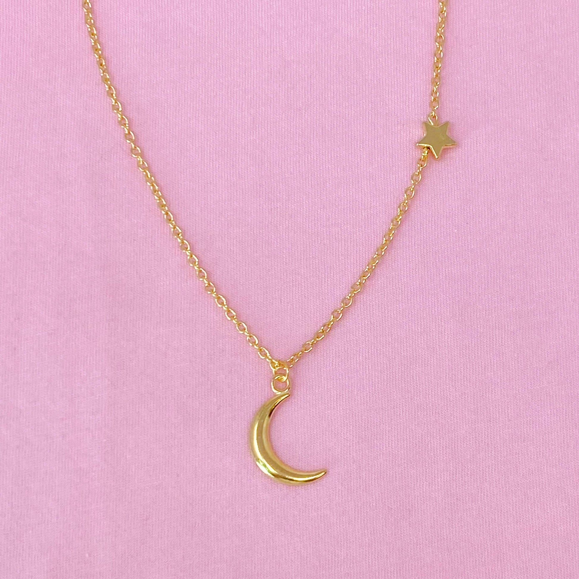 The perfect moon and star combination for all astronomy lovers! This moon charm necklace is paired with a dainty side-hanging star. It's absolutely adorable and stylish!