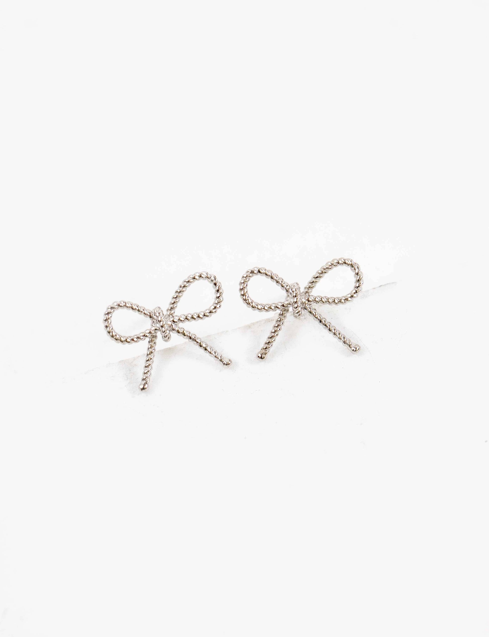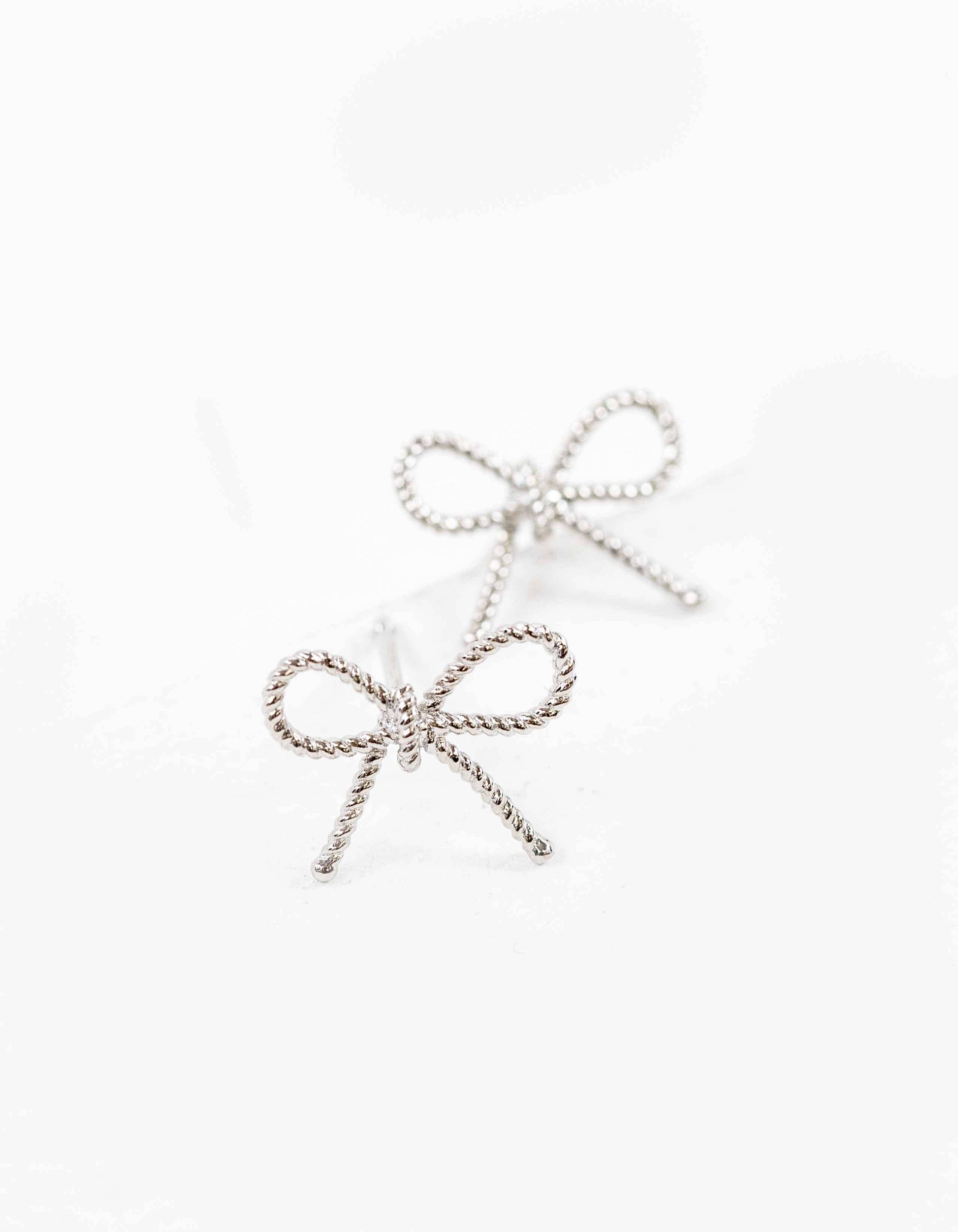 A simple and thin silver bow charm earrings with a roped texture.