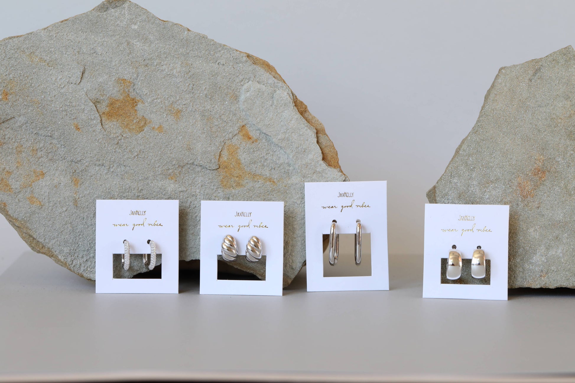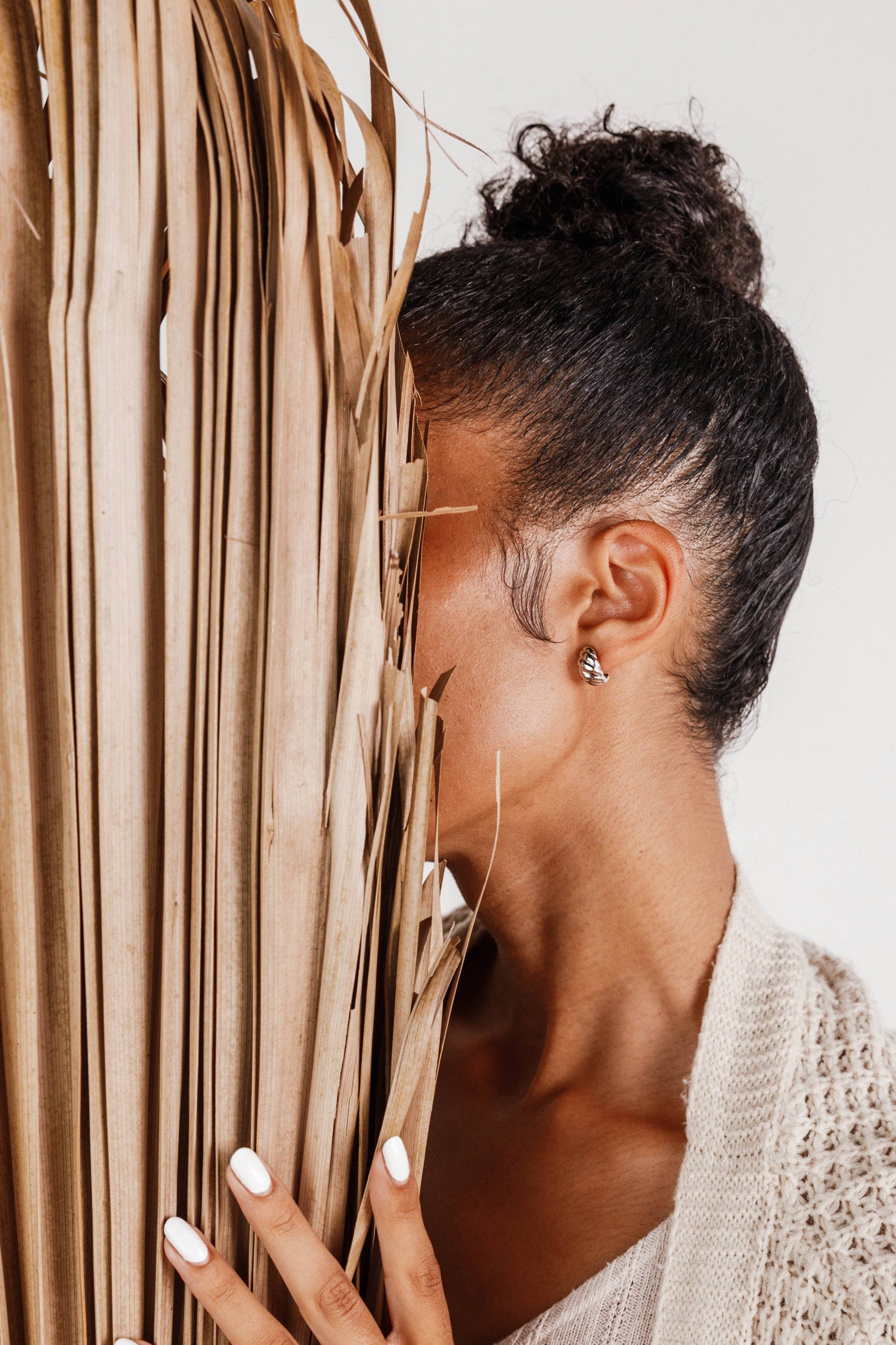 These silver hoop earrings have a simple swirl twist design with a straight post for comfort. The curve of the hoop hugs close to the lobe.