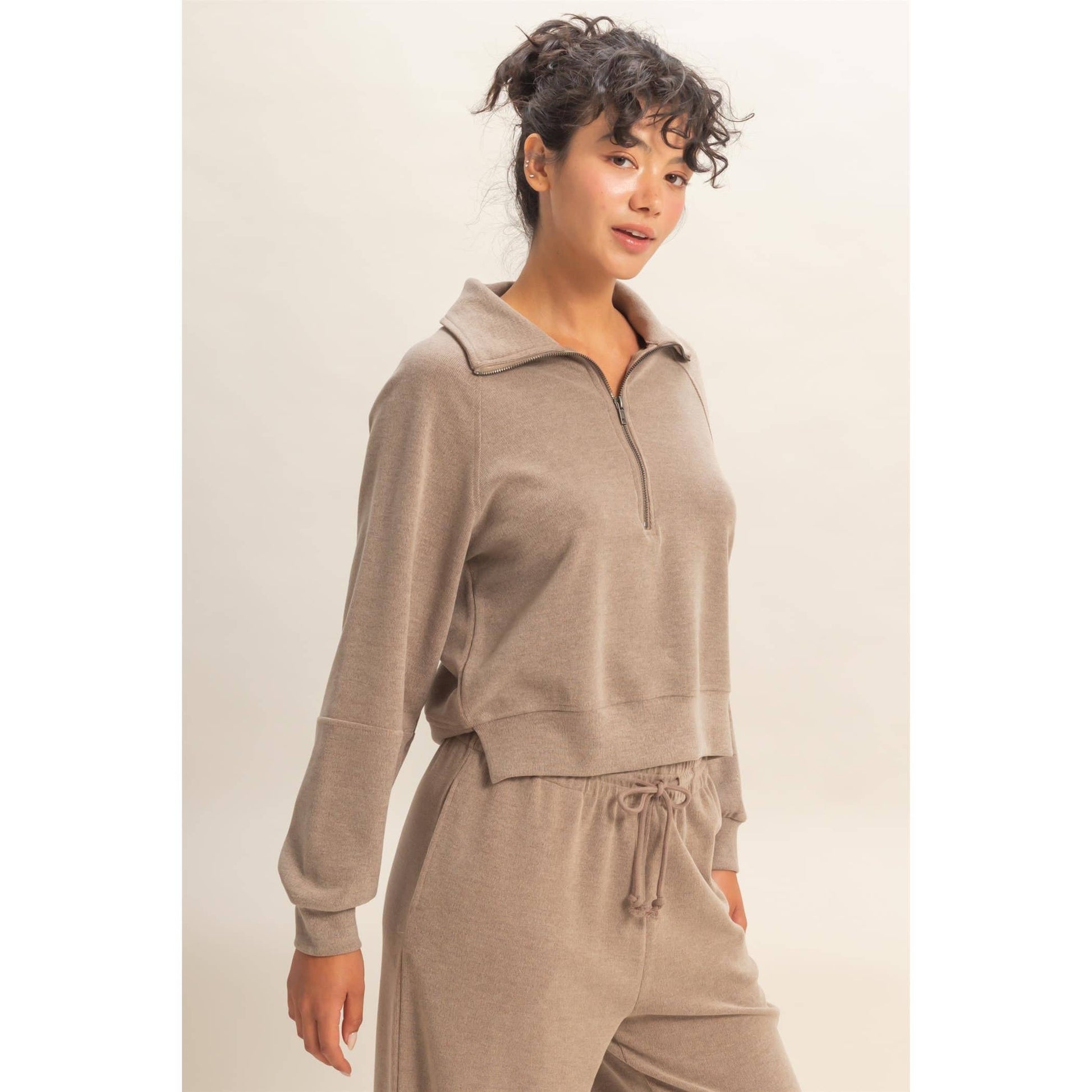 This modern half-zip long sleeve sweatshirt in a zipper closure at the neckline, offering an easy way to transform its silhouette. Crafted with soft ribbed fabric, this top pairs seamlessly with tailored trousers for a refined look or casual shorts for a laid-back setting. Ideal for transitioning through seasons with style and comfort, its loose fit ensures a versatile and fashionable choice for either layering or as a standalone statement.