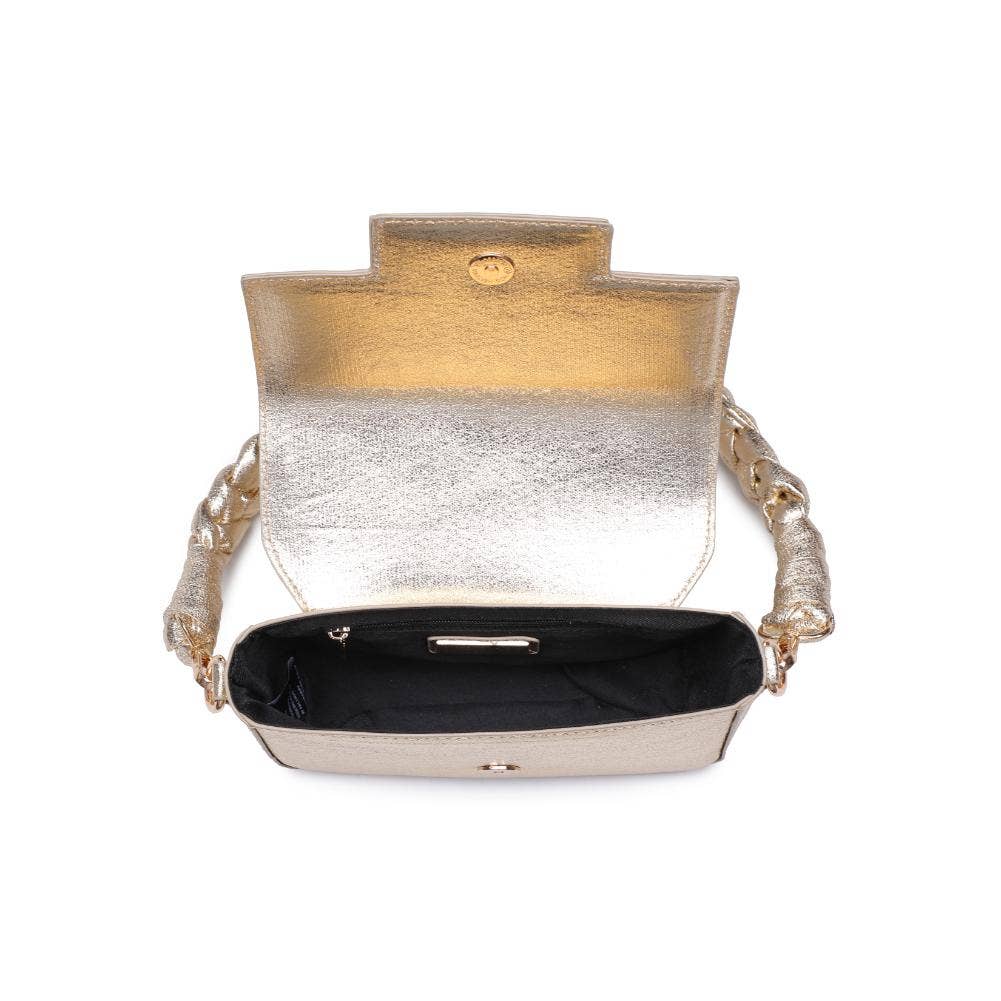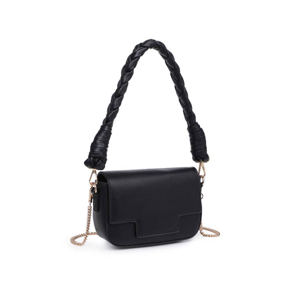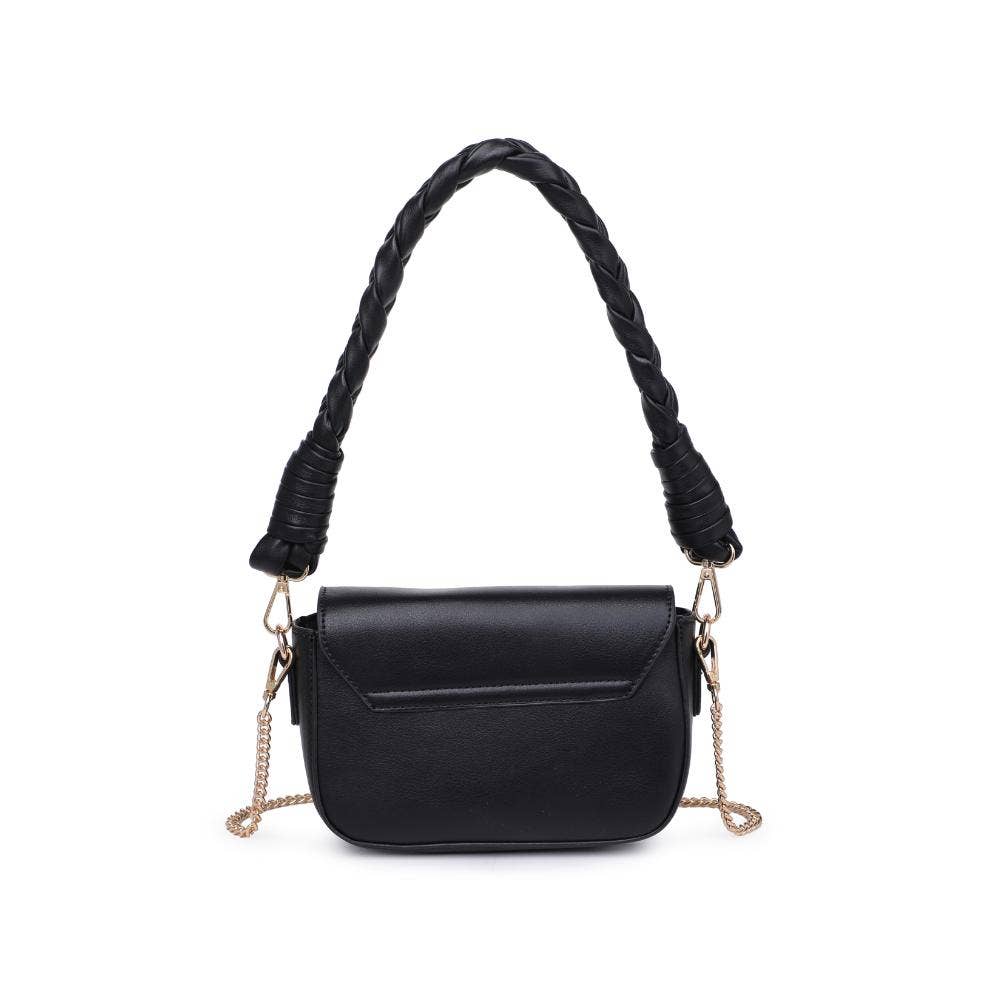 Exterior Details: Smooth Vegan Leather, Braided Handle, Gold Hardware, Detachable Chain Strap