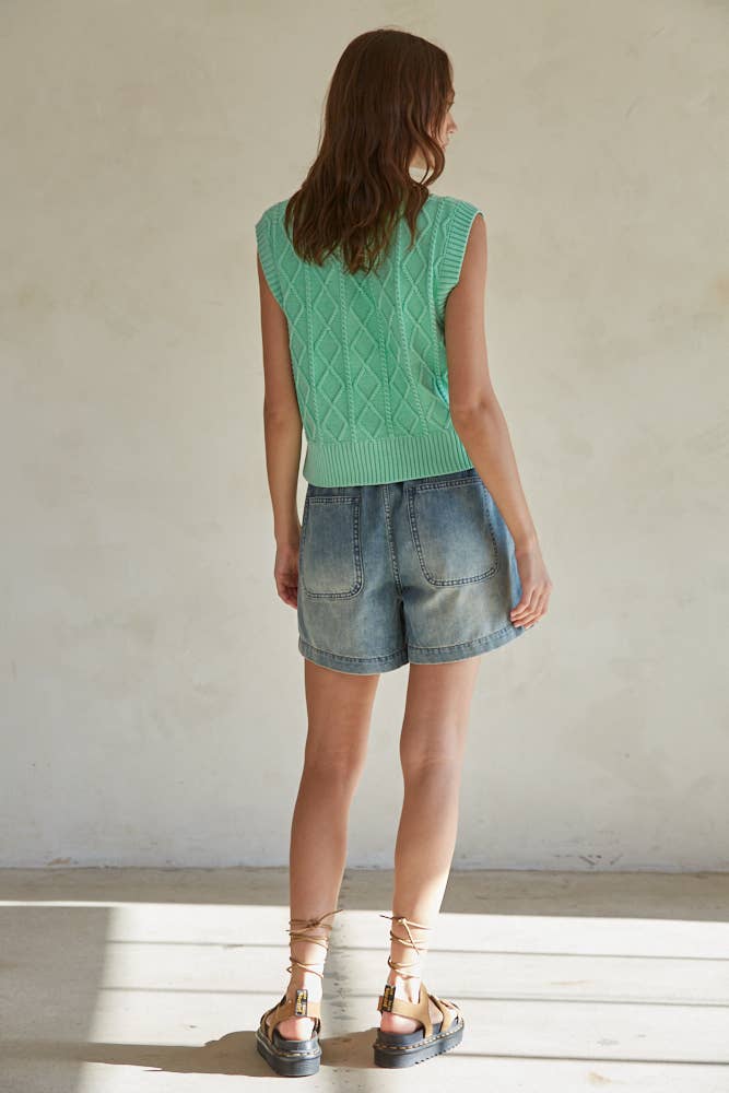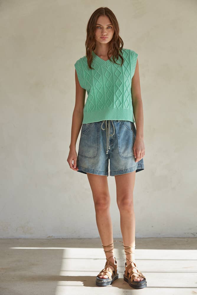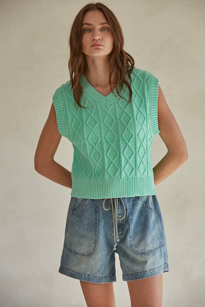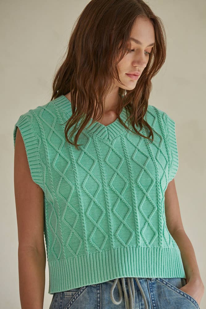Introducing the Braelynn Vest Top - a sleeveless, cable knit sweater made of soft cotton and cozy acrylic. Perfect for those who like to show off their playful side, this V-neck vest top is a quirky and fun addition to any wardrobe. Don't miss out on this unique and stylish piece!