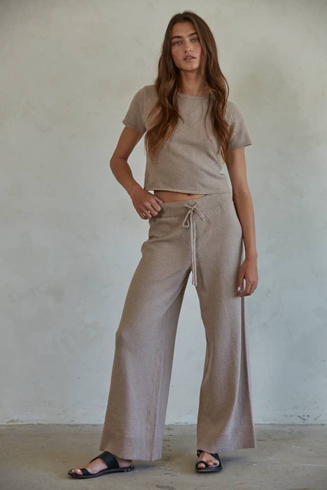 Cozy up in this laid-back knit sweater paired with ultra-comfy wide-leg pants featuring an elastic waistband and drawstring for the perfect fit. Crafted from a breathable cotton-nylon-polyester blend, this duo delivers effortless style and all-day comfort. Whether you're lounging at home or stepping out for casual adventures, this relaxed set keeps you feeling great.